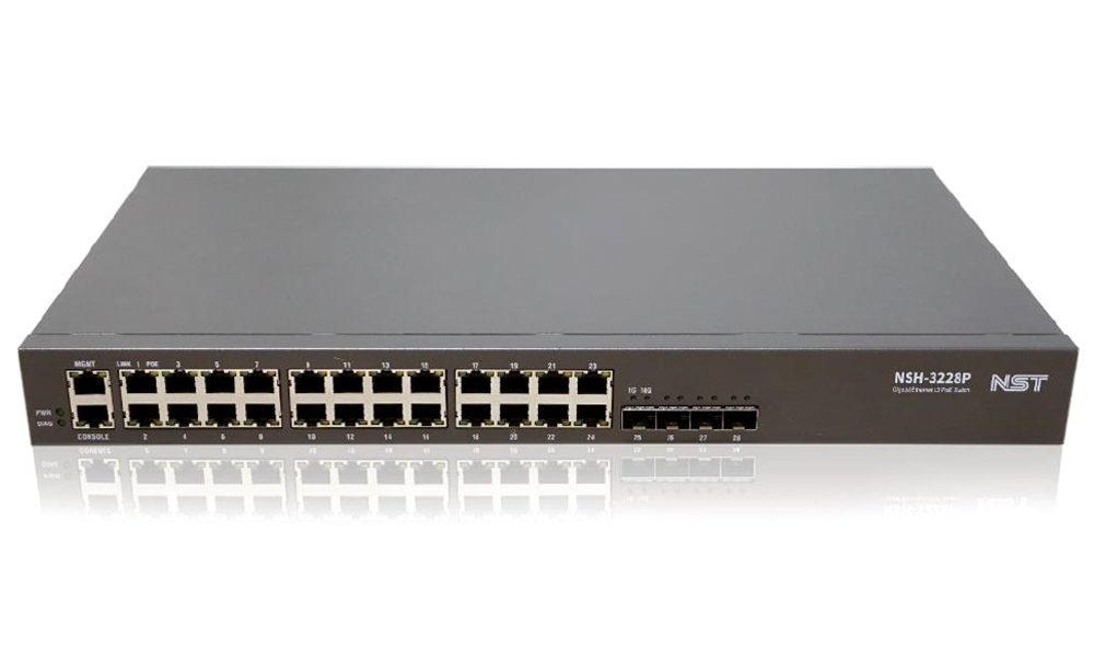 NSH-3228P는 24개의 10/100/1000Mbps PoE 포트와 4개의 10Gbps 업링크 SFP+ 포트를 지원하는 고성능의 L3 PoE 스위치입니다. VLAN, STP, QoS 등의 다양한 L2 기능과 RIP, OSPF, BGP, VRRP 등 다양한 라우팅 프로토콜을 지원하며, SNMP, RMON, Web based Management 등의 네트워크 관리 기능으로 네트워크의 운용을 손쉽게 할 수 있습니다. 또한 CCTV 카메라, 인터넷 전화기, 무선랜 AP를 안정적으로 접속하기 위한 15W급 또는 30W급 IEEE 802.3af/at 표준 PoE를 제공하여 안정적인 전원을 공급합니다. PoE 포트에 연결되어 있는 CCTV 카메라, 무선랜 AP 등이 동작에 이상이 생겨 재부팅이 필요한 경우 해당 PoE 포트의 전원을 리셋함으로서 현장에 방문하지 않고 원격에서 처리가 가능하므로 편리한 운용성을 제공합니다.